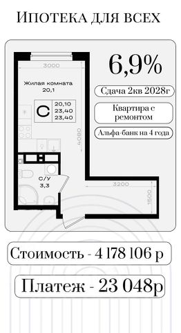 Продается студия, площадью 23.4 м2 в монолитно-кирпичной новостройке. Возможен вариант покупки с использованием ипотечных средств, есть рассрочка, возможна покупка с использованием материнского капитала, есть военная ипотека. Жилая площадь 20.1 м2, квартира без отделки, комнаты смежные. Квартира располагается на 17 этаже 18-этажного дома в ЖК Придонье. Застройщик - ГК ССК, сдача дома - II квартал 2028 года, высота потолков 2.72 м. Дом оборудован пассажирским лифтом. Парковка автомобилей - наземная. Обеспечение безопасности: видеонаблюдение. Инфраструктура: школа, детский сад, поликлиника, детские площадки, спортивные площадки, места для отдыха. Придонье - микрорайон, куда хочется возвращаться и откуда не хочется уезжать. Здесь созданы все условия для теплой, безопасной и семейной жизни - вместе с теми, кто дорог. Микрорайон создан для тех, кто ставит семью на первое место - здесь современные школы и детские сады расположены в шаговой доступности, а традиции добрососедства и атмосфера маленького города делают каждый день теплее и спокойнее. Приобретая просторную трёхкомнатную квартиру в микрорайоне Придонье , вы получаете в подарок качественный ремонт Стандарт. Мы проведем полный цикл отделочных работ - от подготовки поверхностей до чистовой отделки, - чтобы ваше новоселье стало по-настоящему радостным и беззаботным событием. Больше не нужно тратить время на поиск мастеров, выбирать материалы или контролировать работы - просто переезжайте и начинайте жить с комфортом. Микрорайон Придонье создан для тех, кто ценит семейные ценности и стремится дать близким самое лучшее. Здесь, в атмосфере уютного маленького города, вас ждут современные школы и детские сады в шаговой доступности, а добрые традиции добрососедства наполняют каждый день теплом и спокойствием. Это место, где дети растут в безопасной среде, а у взрослых есть всё для комфортной и размеренной жизни среди зелени и продуманной инфраструктуры. Позвоните и узнайте условия покупки прямо сейчас!