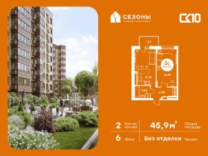 Продаётся 2-комнатная квартира в строящемся доме (Дом 2), срок сдачи: IV-кв. 2026, общей площадью 45.85 кв.м., на 6 этаже. ЖК Сезоны 1 это уникальный проект, созданный вдалеке от шума и суеты мегаполиса. Радоваться каждому дню в любом возрасте здесь будет проще - внутреннее состояние удовольствия поддерживает окружающая обстановка. Комплекс разработан с уникальным планом озеленения, главной идеей которого является зеленый двор круглый год. Большая игровая зона позволит родителям с комфортом проводить время со своими детьми. Закрытая территория обеспечивает безопасность и защиту от нежелательных посетителей, а подземный паркинг сохранит ваш автомобиль в отличном состоянии.