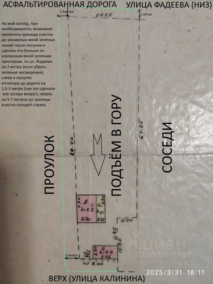 В виду срочности продажи цена снижена с 5,5млн.р. Подъезд к участку возможен с ТРЁХ сторон- с верхней улицы, нижней улицы или с проулка. Размеры участка позволяют его разделить, при желании нового владельца, на 2 или 3 части, после покупки. Дом старого казачьего атамана, построен в 1953 году и носит название ''Райский уголок'', на добротном каменном фундаменте, с подвалом в цоколе, с 2х скатной крышей, вместительным чердаком и летней верандой, которую можно утеплить и превратить в зимний сад, стены-мазанка и кирпич. Сохранено убранство былых времён- пол, потолок, стены, проводка, мебель (кровати, столы, шкафы, сервант и т.п.). Дом жилой, тёплый, зимний. Из улучшений - проведён газ и установлен газовый котёл для обогрева помещения.