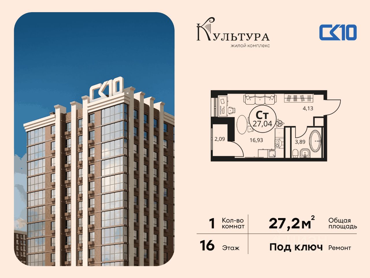 Продаётся студия в строящемся доме (Секции 2.1 - 2.2), срок сдачи: I-кв. 2027, общей площадью 27.24 кв.м., на 16 этаже. Новый жилой комплекс ''Культура'' от группы компаний ''СК10'' расположен по адресу: г. Ростов-на-Дону, по ул. Текучёва.