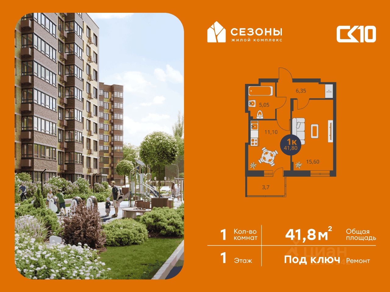 Продаётся 1-комнатная квартира в строящемся доме (Дом 1), срок сдачи: IV-кв. 2026, общей площадью 41.8 кв.м., на 1 этаже. ЖК Сезоны 1 это уникальный проект, созданный вдалеке от шума и суеты мегаполиса. Радоваться каждому дню в любом возрасте здесь будет проще - внутреннее состояние удовольствия поддерживает окружающая обстановка.