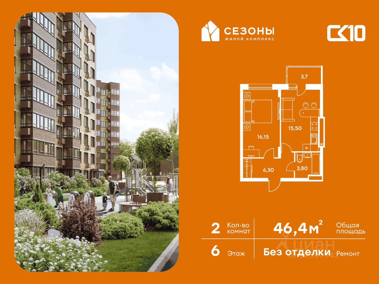 Продаётся 2-комнатная квартира в строящемся доме (Дом 4), срок сдачи: IV-кв. 2026, общей площадью 46.35 кв.м., на 6 этаже. ЖК Сезоны 1 это уникальный проект, созданный вдалеке от шума и суеты мегаполиса. Радоваться каждому дню в любом возрасте здесь будет проще - внутреннее состояние удовольствия поддерживает окружающая обстановка.