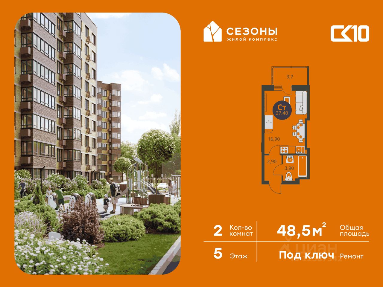 Продаётся 2-комнатная квартира в строящемся доме (Дом 3), срок сдачи: IV-кв. 2026, общей площадью 48.55 кв.м., на 5 этаже. ЖК Сезоны 1 это уникальный проект, созданный вдалеке от шума и суеты мегаполиса. Радоваться каждому дню в любом возрасте здесь будет проще - внутреннее состояние удовольствия поддерживает окружающая обстановка.
