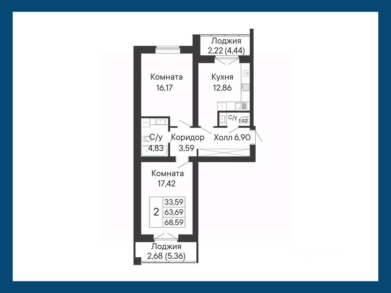 Данное планировочное решение просторная двухкомнатная квартира с двумя санузлами и двумя лоджиями, на кухне и в одной из комнат.