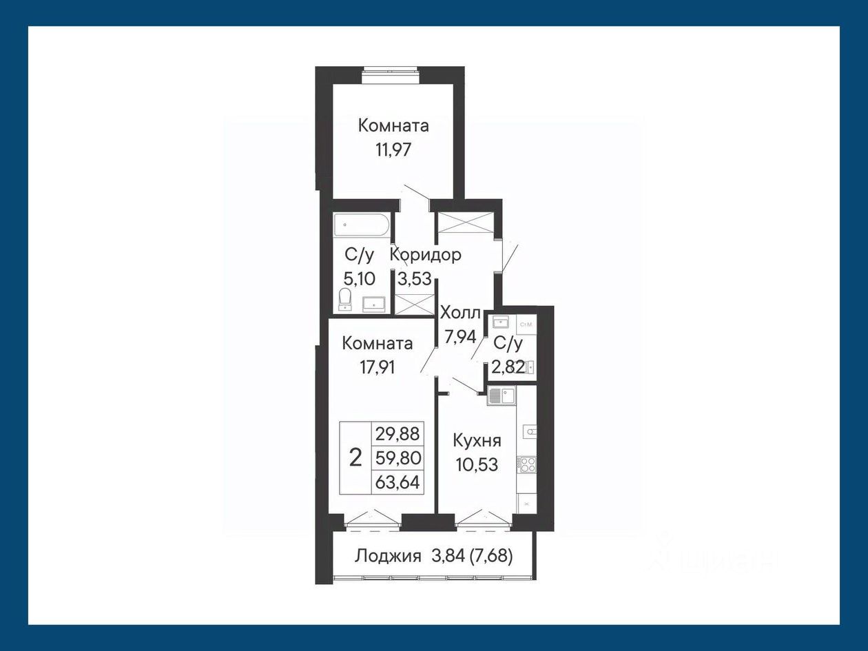 Данное планировочное решение двухкомнатной квартиры позволит создать пространство для отдыха и совместного времяпрепровождения: из гостиной и кухни есть выходы на лоджию.