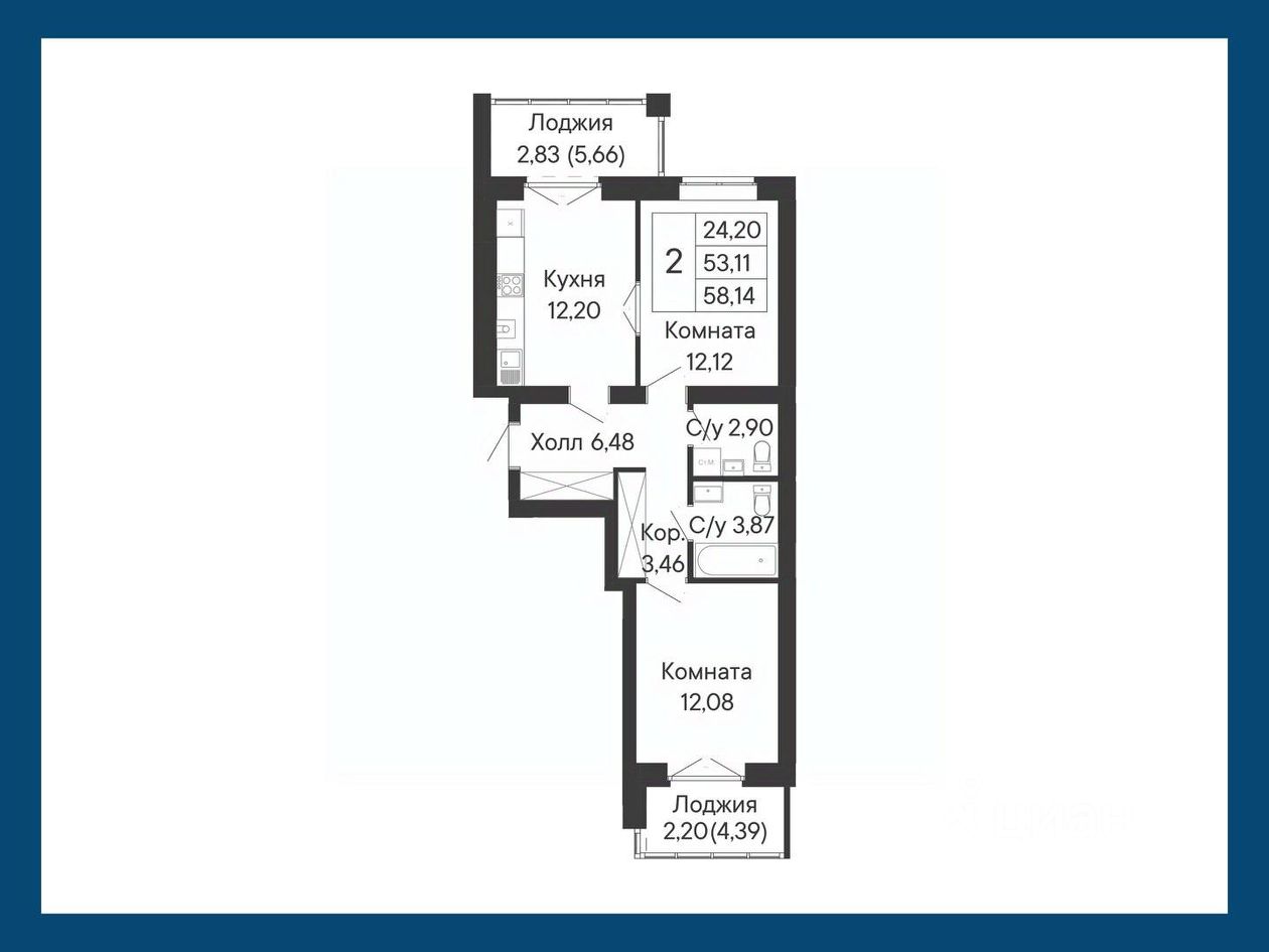Данное планировочное решение представляет собой двухкомнатную квартиру с двумя лоджиями в просторной кухне и спальне. Кухня и вторая комната смежные.