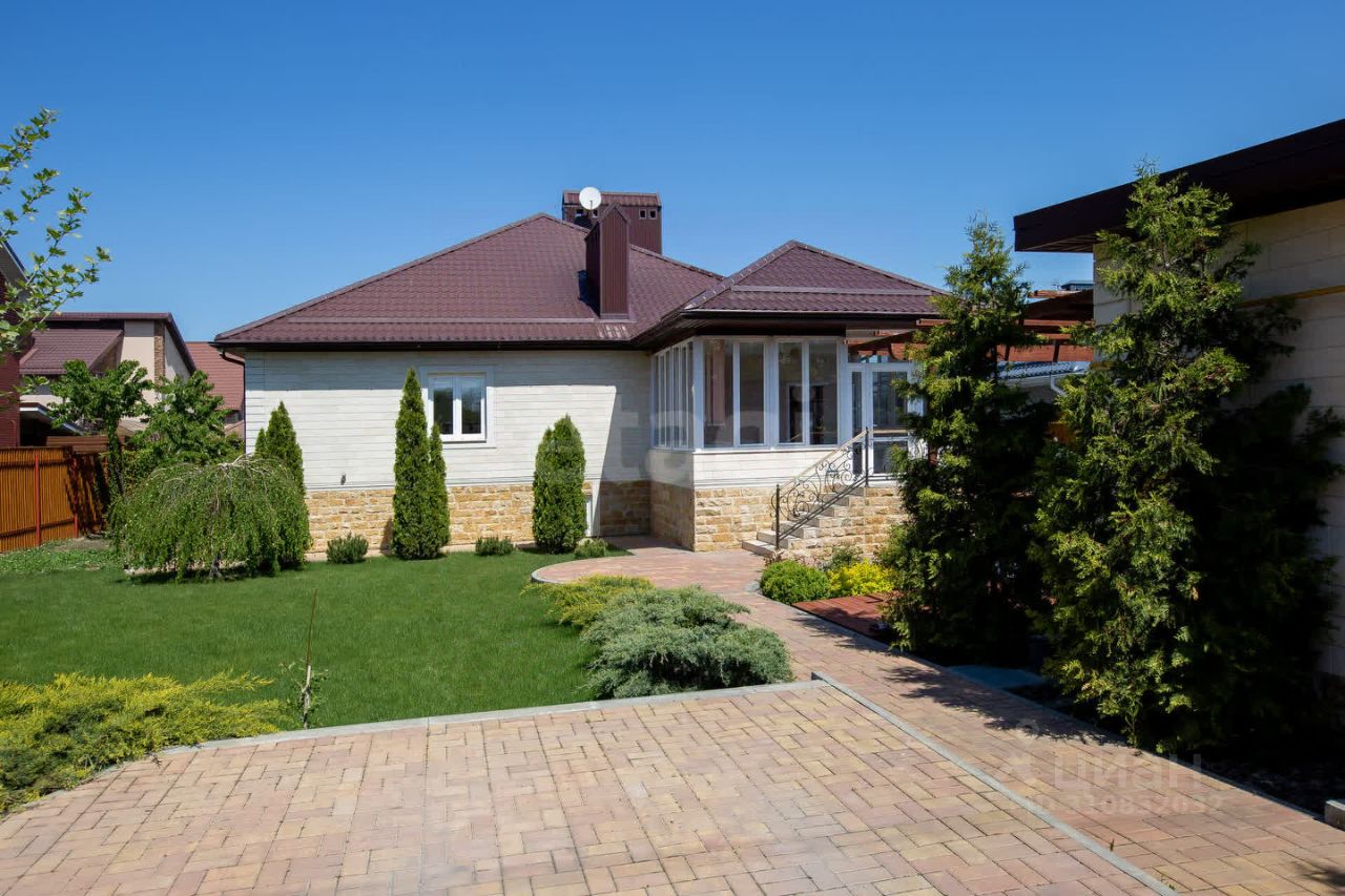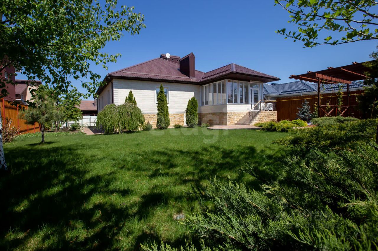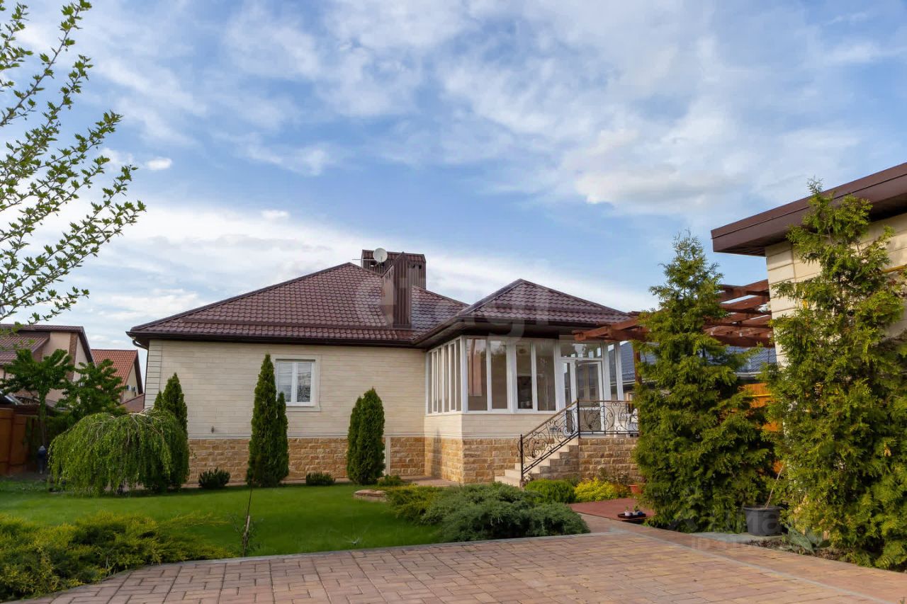 Просторный, уютный, одноэтажный дом, с цокольным этажом, на участке 8.8 соток, в тихом месте, элитного поселка х. Камышеваха, общей площадью 349 кв.м. Дом построен в 2019 году, на фундаментной, монолитной плите по технологии каркасно-монолитного строительства, с применением системы несъёмной опалубки из древобетона от компании Durisol. В дом ведут два отдельных входа: парадный и в цокольный этаж. Внешняя отделка стен выполнена из Акушинского песчаника и доломита (дагестанский камень), с дополнительным утеплением стен пеноплексом (дом очень тёплый и энергоэффективный). В доме 8 комнат в т.ч.: 3 спальни, гостевая комната, кабинет, просторный холл, две кухни, гостинная с домашним кинотеатром, бильярдная (русский бильярд, стол 12 футов), библиотека, каминный зал, хаммам (отделка турецким мрамором), три санузла: с угловой ванной и двумя душевыми кабинами. Приусадебный участок зонально разделен на две части: декоративная часть с деревьями, кустарниками и газоном, и садово- огородная с плодоносящими деревьями, везде смонтирована система автополива. Реализована система умный дом, с управлением климатом, и система видеонаблюдения. Есть просторная летняя веранда, с панорамным остеклением, мастерская, мангальная зона, пергола из лиственницы, капитальный гараж на две машины, с раздельными автоматическими гаражными воротами и парковочное место во дворе с автоматическими откатными воротами. Один взрослый собственник. Владение более 5 лет. Дом строился добротно, с использованием дорогих материалов, для комфортного проживания- всё продумано до мелочей!