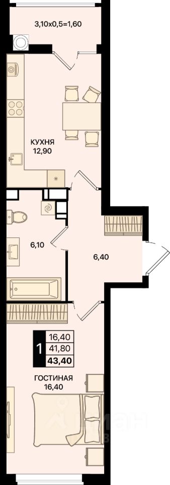 Общая площадь43,4 м2