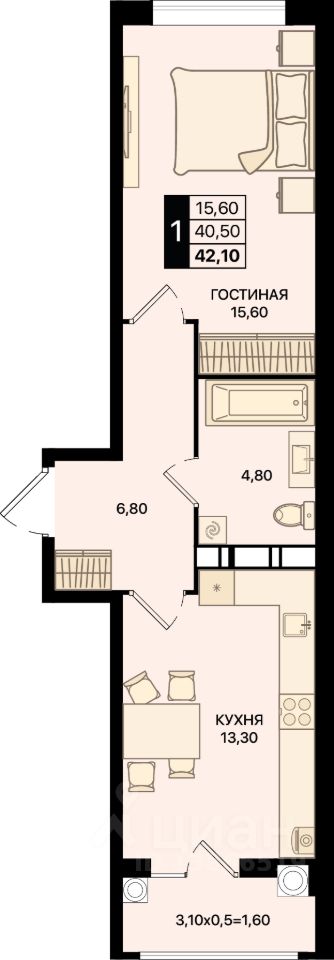 Общая площадь42,1 м2