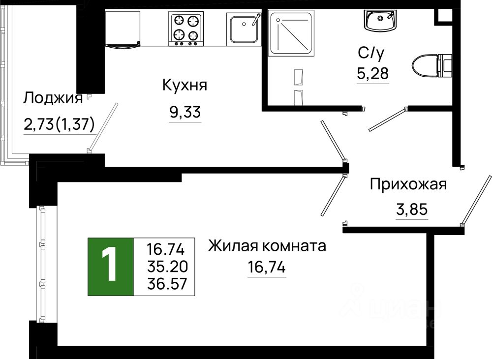 Общая площадь36,57 м2