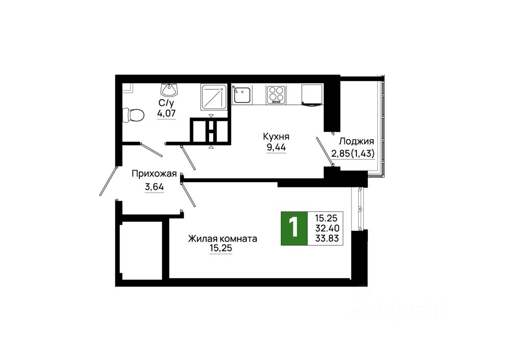 Общая площадь33,83 м2