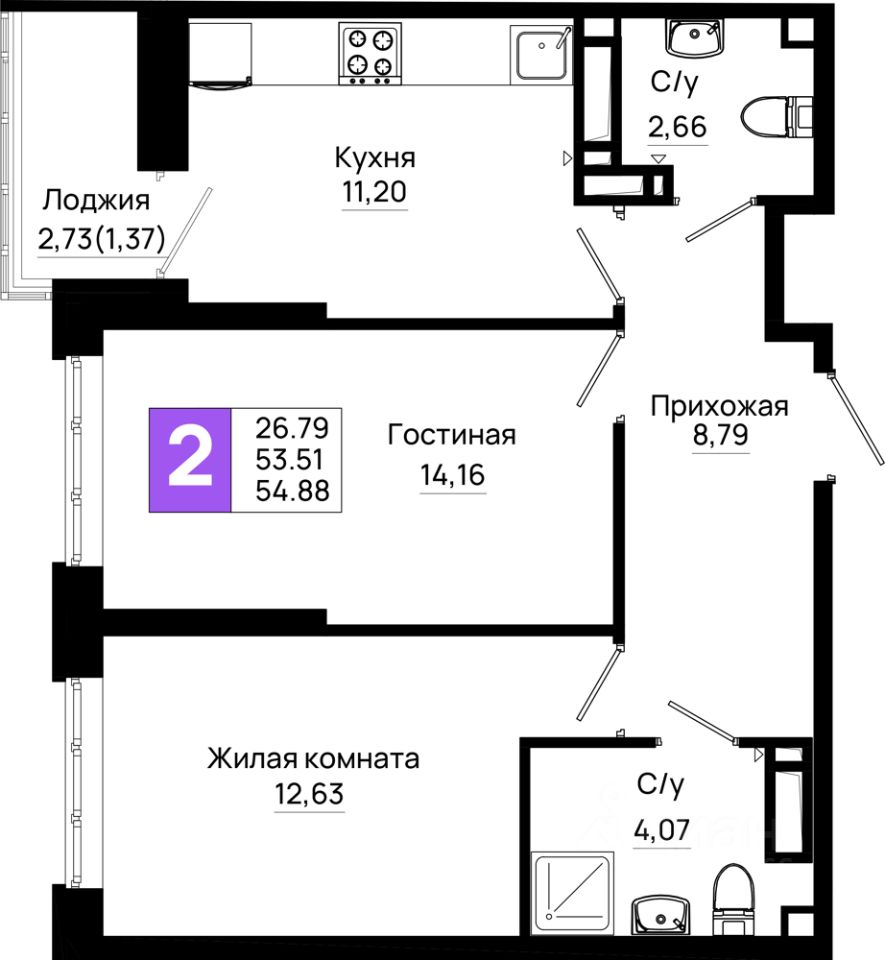Общая площадь54,88 м2