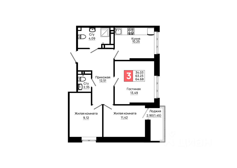 Общая площадь64,68 м2