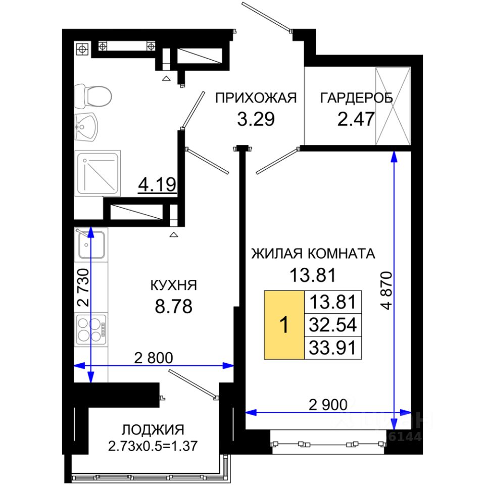 Общая площадь33,91 м2