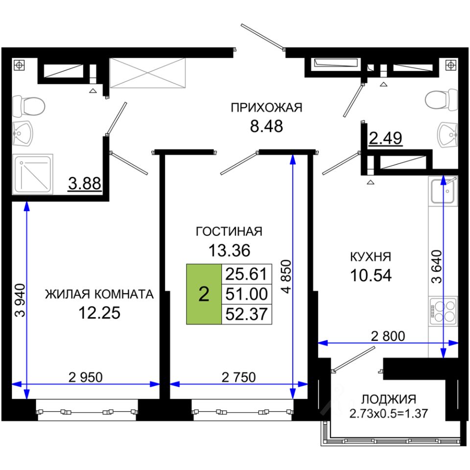 Общая площадь52,37 м2