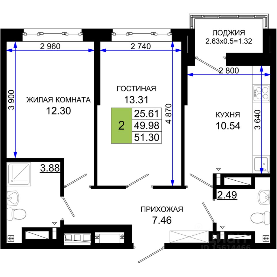 Общая площадь51,3 м2