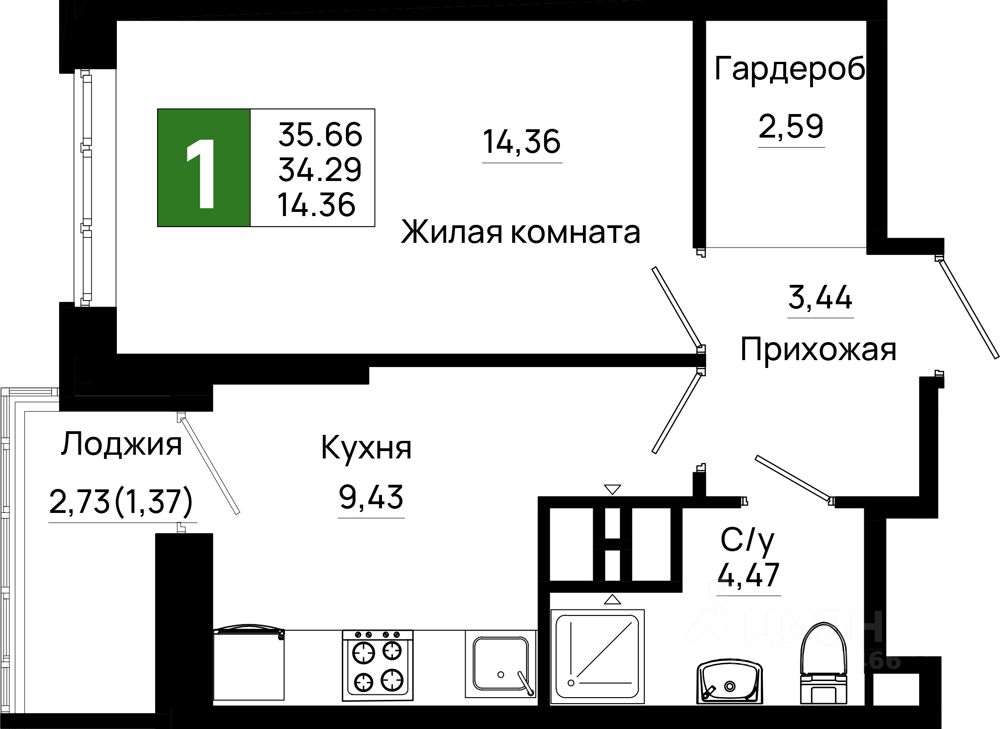 Общая площадь35,66 м2