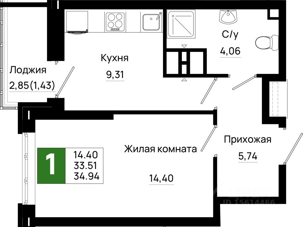 Общая площадь34,94 м2
