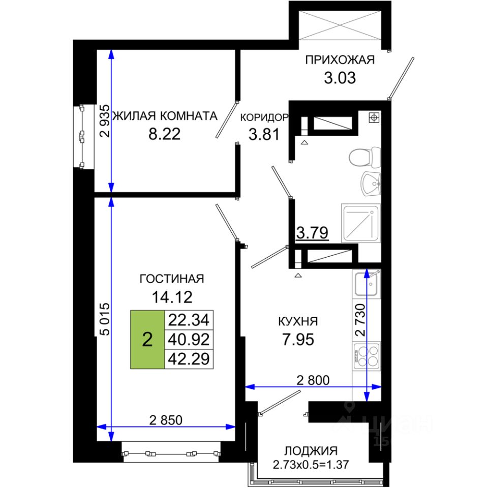 Общая площадь42,29 м2