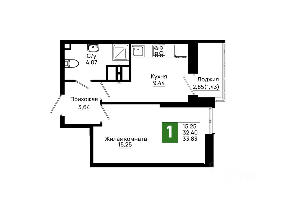 Общая площадь33,83 м2