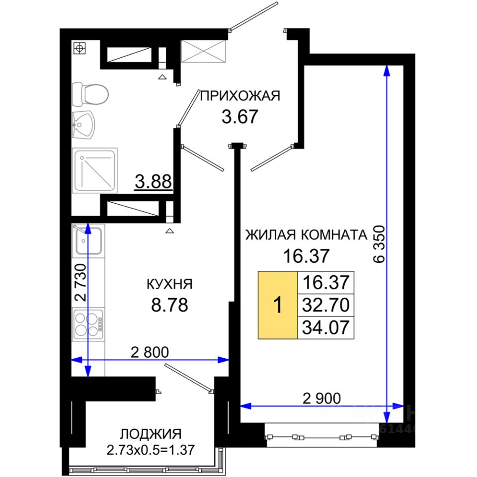 Общая площадь34,07 м2