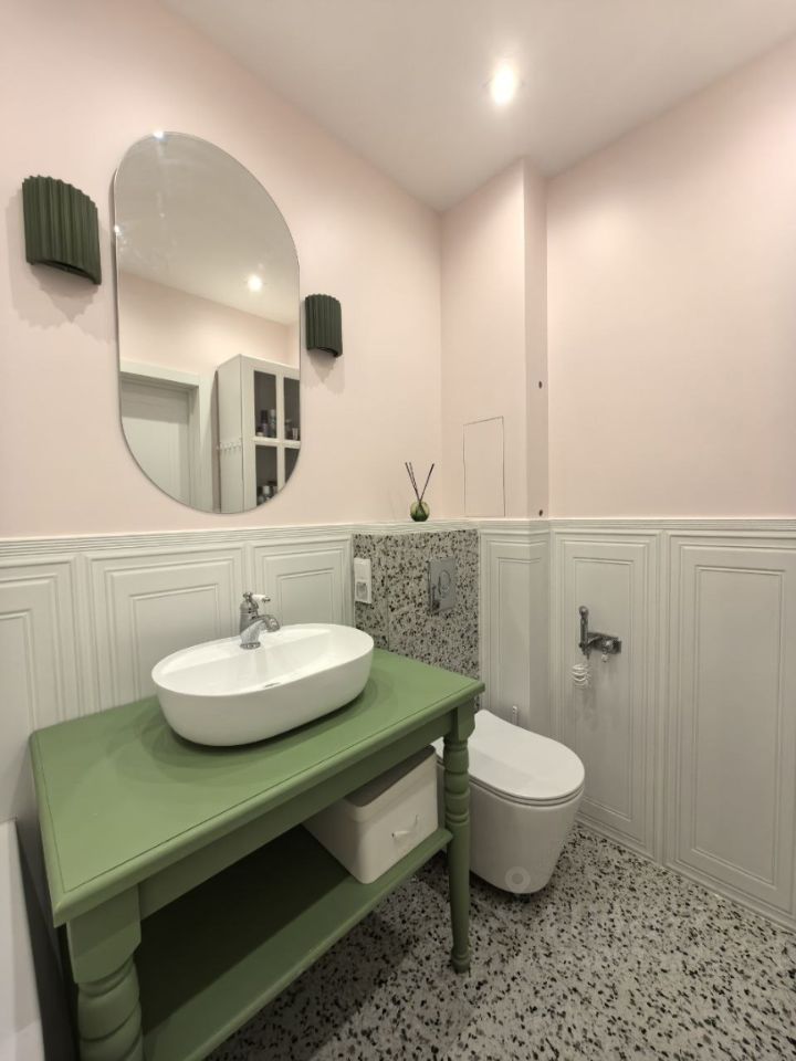 Молдинги, 3D панели и плинтус производства Orac Dcor (прочный полиуретан). На полу фактурный водостойкий немецкий ламинат 33 класса. Все стены и потолок перед окрашиванием были укреплены стеклосеткой, а затем окрашены моющейся краской Majestic премиум класса. Выполнена шумоизоляция стен толщиной 10 см с соблюдением технологии. Потолок из влагостойкого гипсокартона. Подоконники из акрилового искусственного камня.