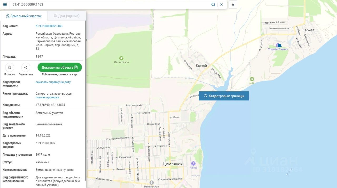 Код лота: РАД-435891. Реализуется на торгах. Реализуется земельный участок, расположенный в живописной местности возле туристического комплекса ''Саркел'' в Ростовской области, представляющий собой идеальное место для отдыха и наслаждения природой, по адресу: Ростовская область, Цимлянский район, посёлок Саркел, Западный переулок, дом 33. Этот участок находится в непосредственной близости к Цимлянскому водохранилищу, что обеспечивает великолепные виды на водную гладь и окружающие пейзажи. Вдоль береговой линии раскинулись зелёные насаждения, создавая атмосферу уединения и спокойствия. Здесь можно заняться пешими прогулками, велосипедными поездками и рыбалкой на реке Дон. В летнее время популярны купания и пикники на берегу. Земельный участок неправильной вытянутой треугольной формы, без строений, деревьев, общей площадью 1917 кв. м. Категория земель: земли населенных пунктов, виды разрешенного использования: для ведения личного подсобного хозяйства (приусадебный земельный участок). Кадастровый номер 61:41:0600009:1463. С одной стороны участок окружают виноградники, а с другой стороны туристический комплекс - Усадьба Саркел, известный своим виноделием и сыроварней. В окрестностях можно найти памятники архитектуры и исторические места, такие как старинные церкви и усадьбы. Транспортная доступность хорошая, в шаговой доступности остановки общественного транспорта. На расстоянии 5 км - г. Цимлянск - 5 км, г. Волгодонск- 17 км, г. Ростов-на-Дону - 243 км. Объект принадлежит собственнику на праве собственности, о чем в Едином государственном реестре недвижимого имущества и сделок с ним сделана запись регистрации 61:41:0600009:1463-61/192/2023-1 от 30. 11. 2023. Особые отметки: ограничения прав на земельный участок, предусмотренные ст. 56 Земельного кодекса РФ. Подробная информация содержится в выписке с ЕГРН. Ограничения прав и обременение: не зарегистрировано. Продажа осуществляется на ЭТП РАД, дата аукциона - 23. 12. 2025г. https://catalog. lot-online. ru/index. php?dispatch=products. view&product_id=1582923