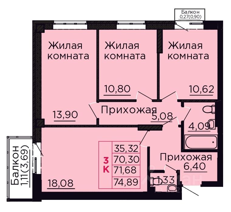 Общая площадь71,41 м2