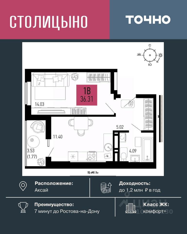 продам 1-к, Аксай5 446 500 ₽