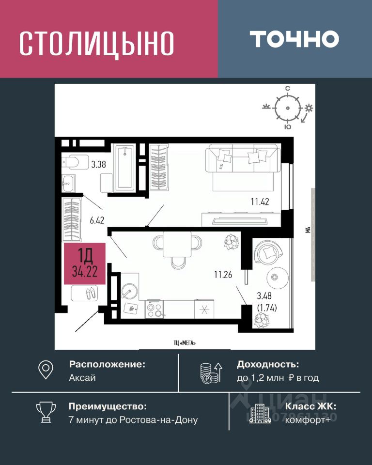 продам 1-к, Аксай5 885 840 ₽