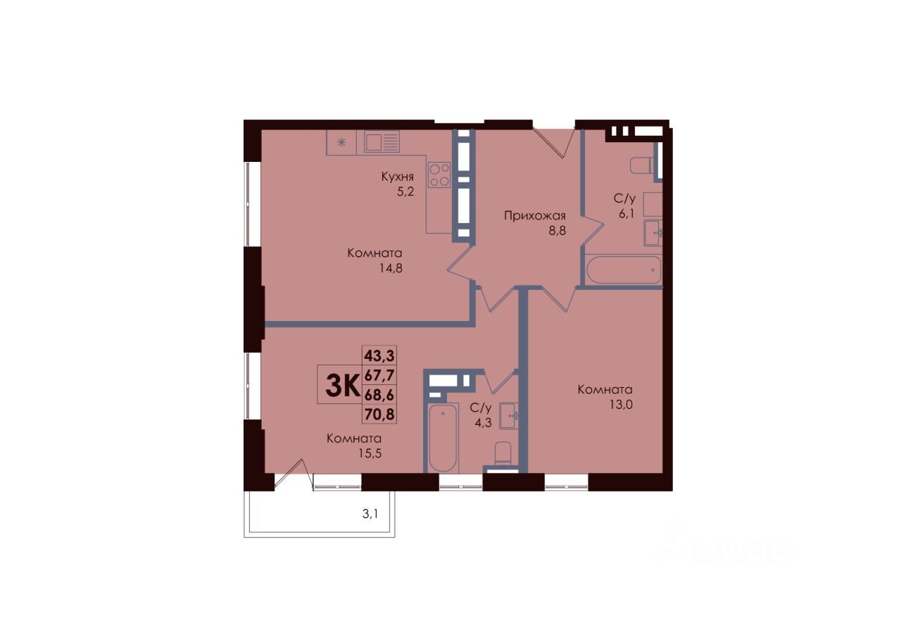 Общая площадь68,6 м2