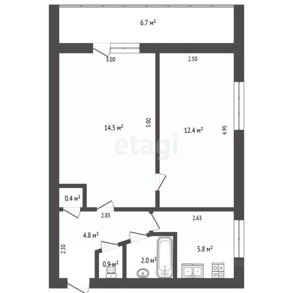 Двухкомнатная квартира общей площадью 40,8 м² расположена на высоком первом этаже пятиэтажного кирпичного дома 1976 года постройки. Планировка отличается рациональностью: две смежные комнаты площадью 12,4 и 14,5 м² и компактная кухня 5,8 м². Ключевым преимуществом объекта является большая застекленная лоджия протяженностью на две комнаты площадью 6,7 м², что существенно увеличивает полезное пространство и создает дополнительную зону для отдыха. Окна выходят на две стороны — во двор и на улицу, обеспечивая хорошую инсоляцию. В квартире выполнен косметический ремонт, установлены металлопластиковые окна, имеется вся необходимая техника — кондиционер, холодильник и стиральная машина, а также мебель, которая остается новому владельцу. Коммуникации центральные: водоснабжение и газоснабжение, санузел совмещенный.