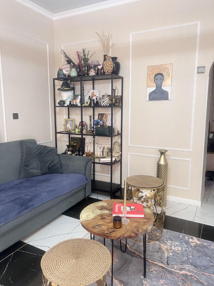 В квартире сделан современный ремонт из качественных материалов. Светлые стены с молдингами, в гостиной, коридоре, кухне и санузле — красивая глянцевая плитка, в спальне и детской — ламинат. Кухня делалась на заказ, вся мебель и встроенная техника остаются новым хозяевам. Санузел раздельный.