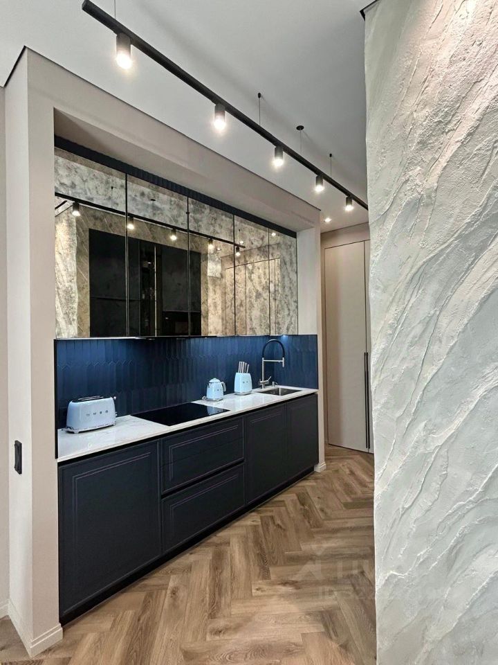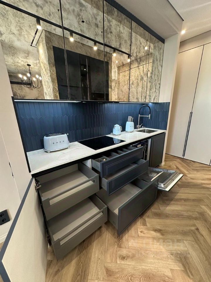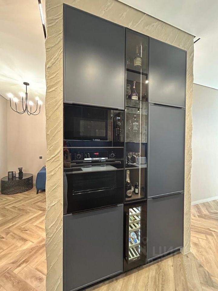 Вся мебель сделана на заказ по дизайн проекту в том числе использовано натуральное дерево карагач. Техника Bosch.