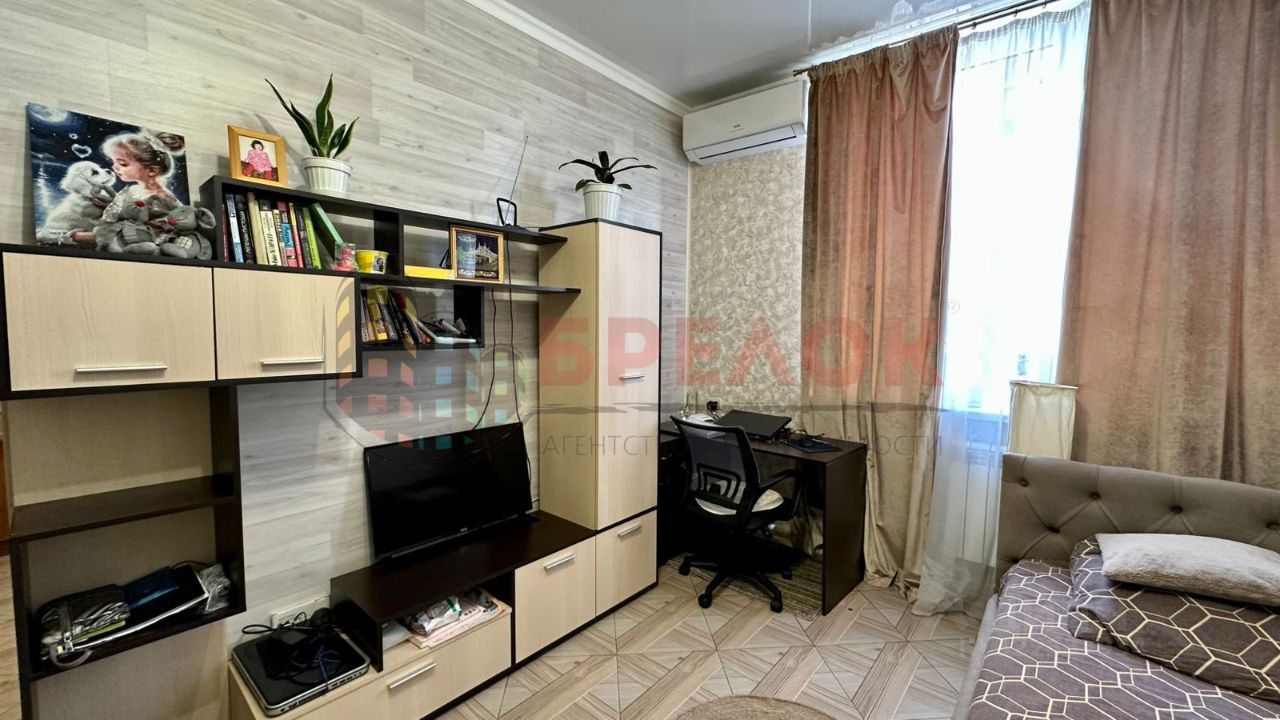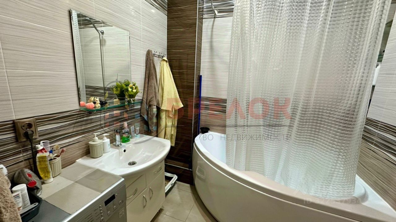 Квартира полностью укомплектована мебелью и техникой, установлен кухонный гарнитур, электрическая печь и электрическая духовка. Из кухни выход на просторную лоджию. Санузел совмещенный, установлена большая ванна. Площадь квартиры 42м2.
