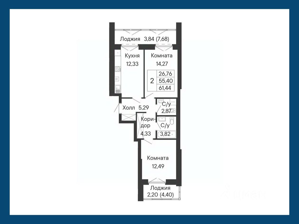 Планировочное решение этой двухкомнатной квартиры имеет следующие преимущества: выход на лоджию предусмотрен из комнаты и кухни, также своя лоджия есть во второй комнате.
