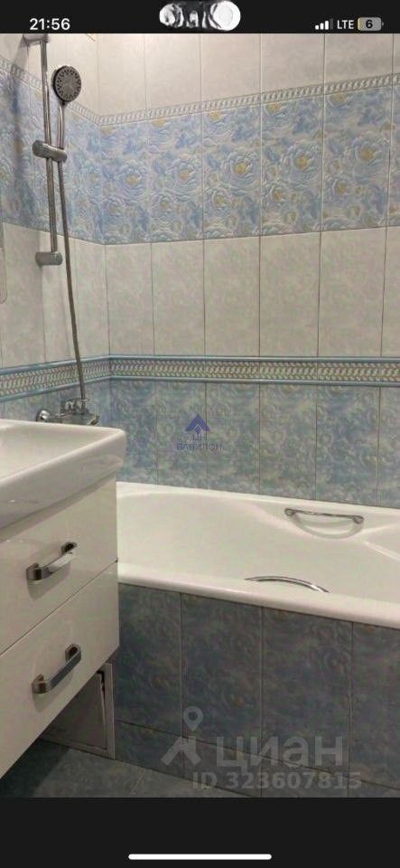 5. Ухоженная Ванная Комната : • Чистота и Функциональность: Ванная комната отделана приятной сине-белой плиткой, оснащена ванной, раковиной с тумбой и современным смесителем.