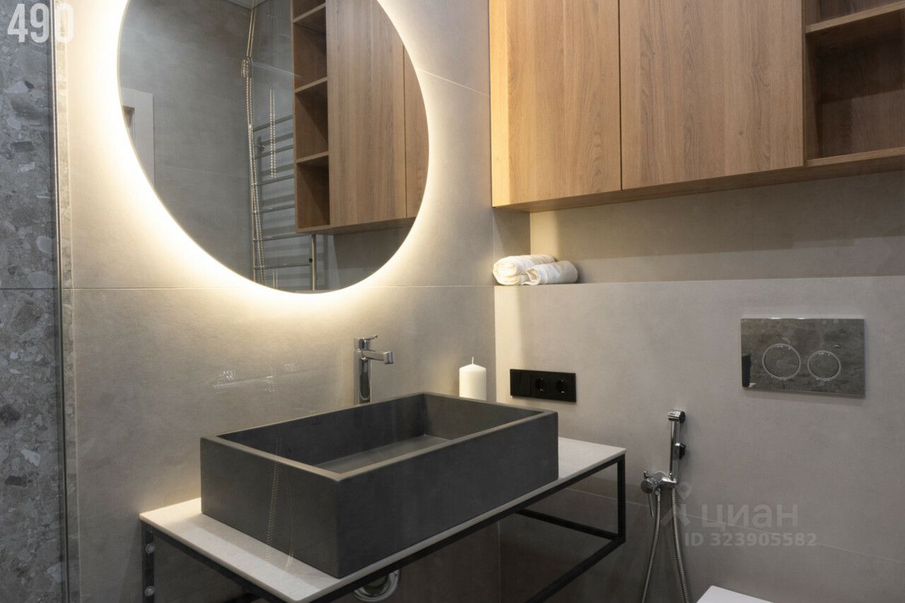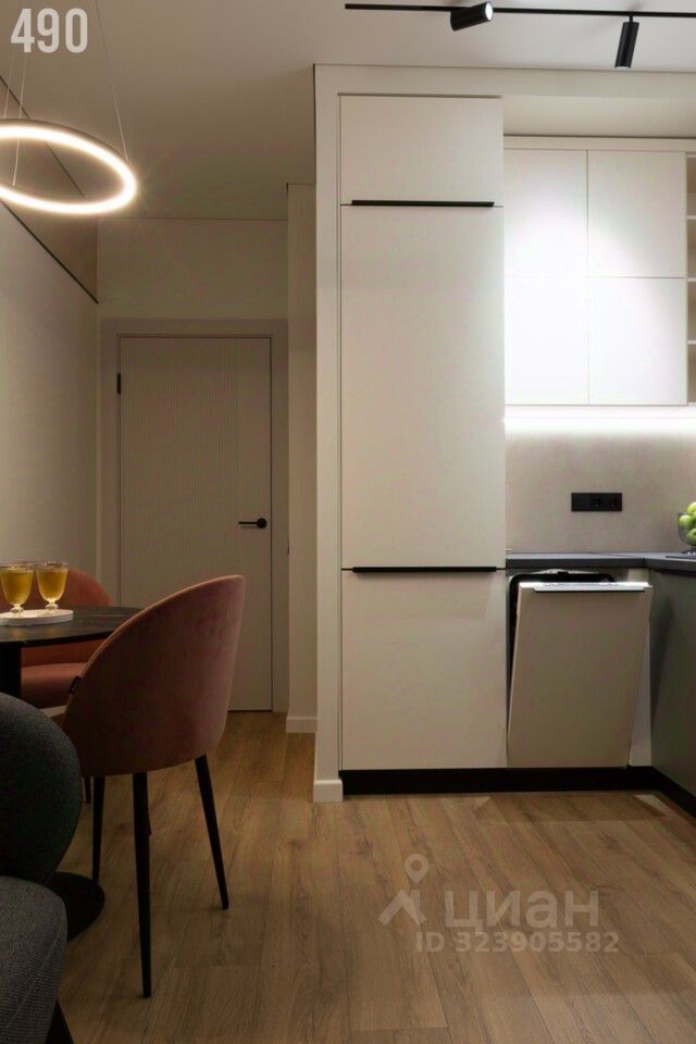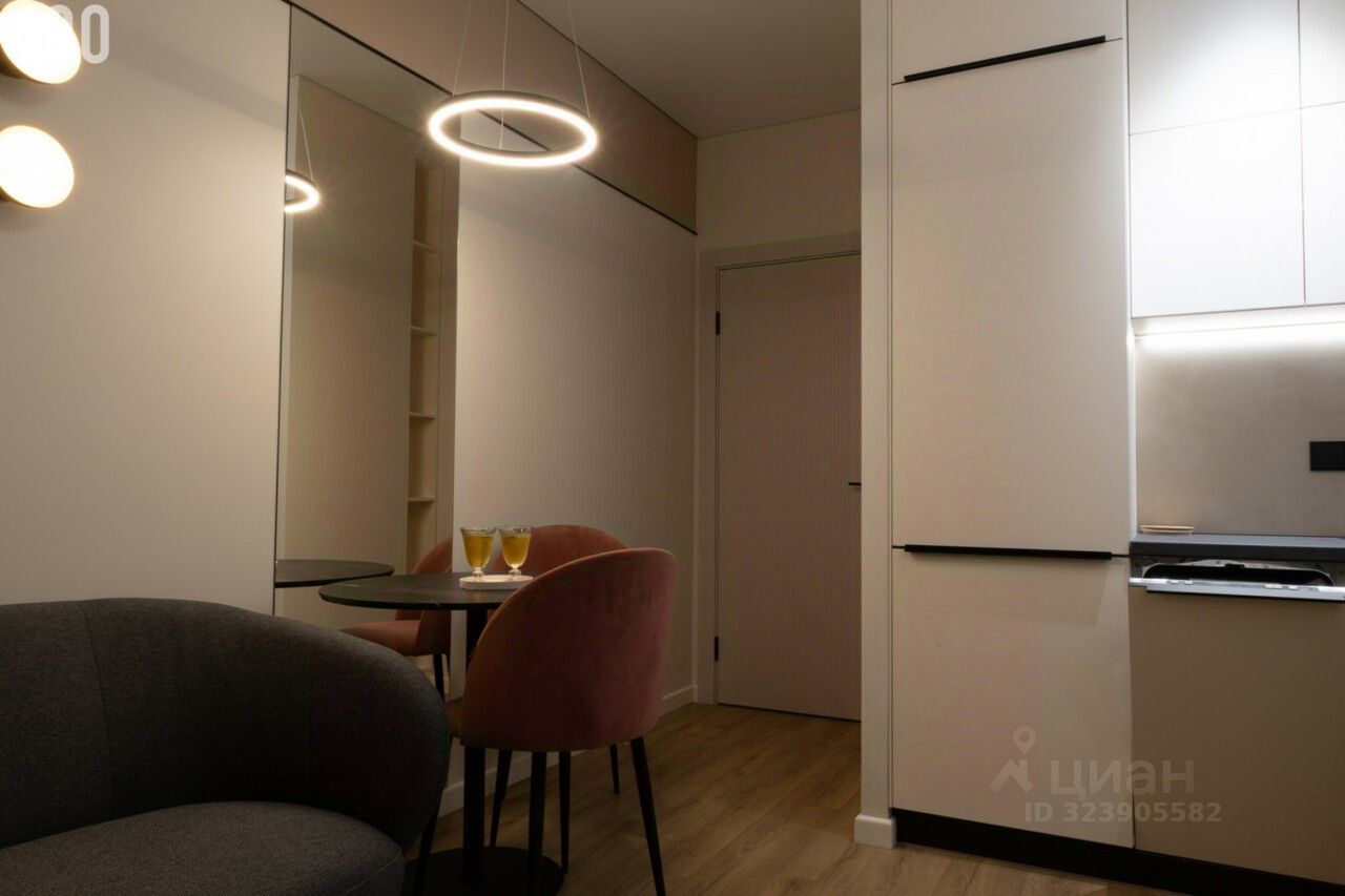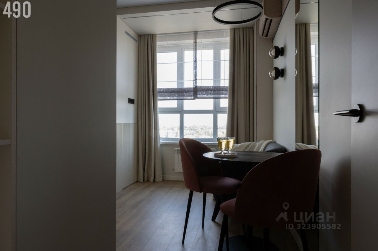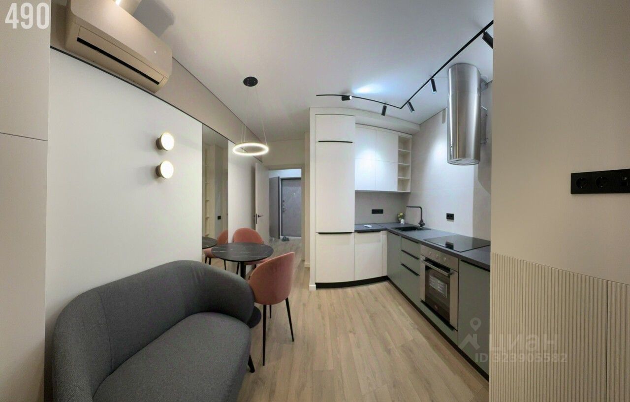 • кухонная мебель с доводчиками • духовой шкаф, посудомоечная машинка, встроенный холодильник, варочная панель с вытяжкой. • сплит в цвет стен • большое зеркало в обеденной зоне, диван • многоуровневое освещение, светильники • римские шторы, выполнены на заказ • заниженные панорамные окна с видом на Дон