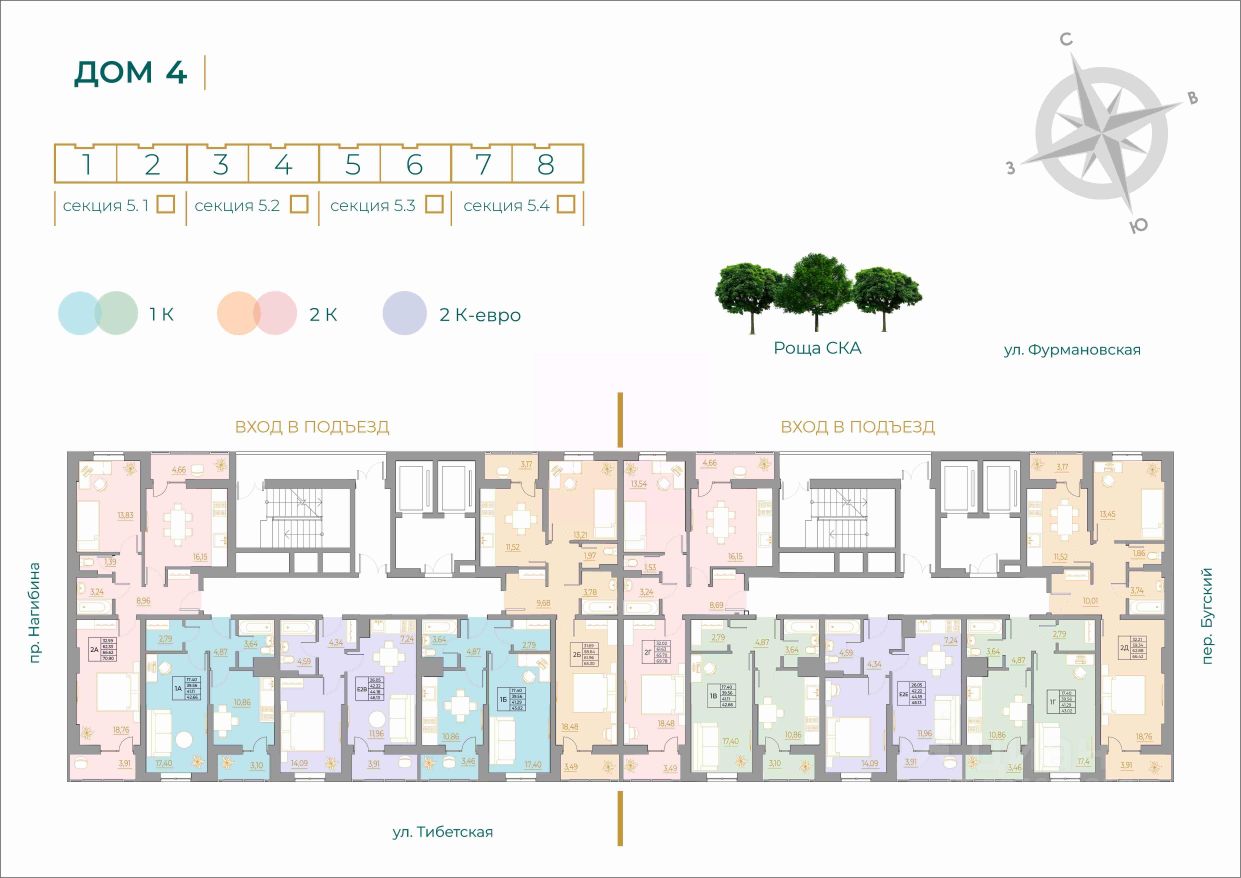 Расположение: •Отличная транспортная доступность: рядом остановка, удобный выезд на Нагибина •До центра 10 минут на автомобиле •В 7 минутах пешком — аквапарк H2O и ТЦ ''Горизонт'' с кинотеатром, Ашаном и фитнес-центром •Рядом роща СКА— отличное место для прогулок и отдыха