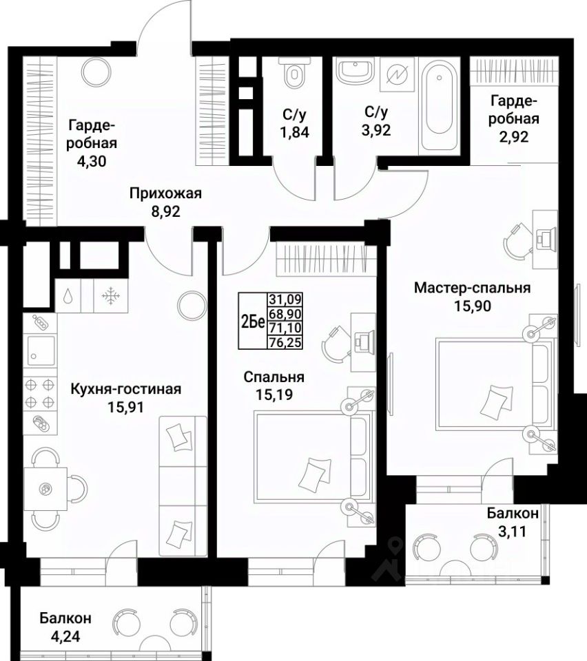 О квартире: — светлая кухня-гостиная 16 кв.м. с выходом на балкон — 2 большие спальни — удобный раздельный санузел — просторные гардеробные — 2 балкона — 3 этаж — потолки 3 м.