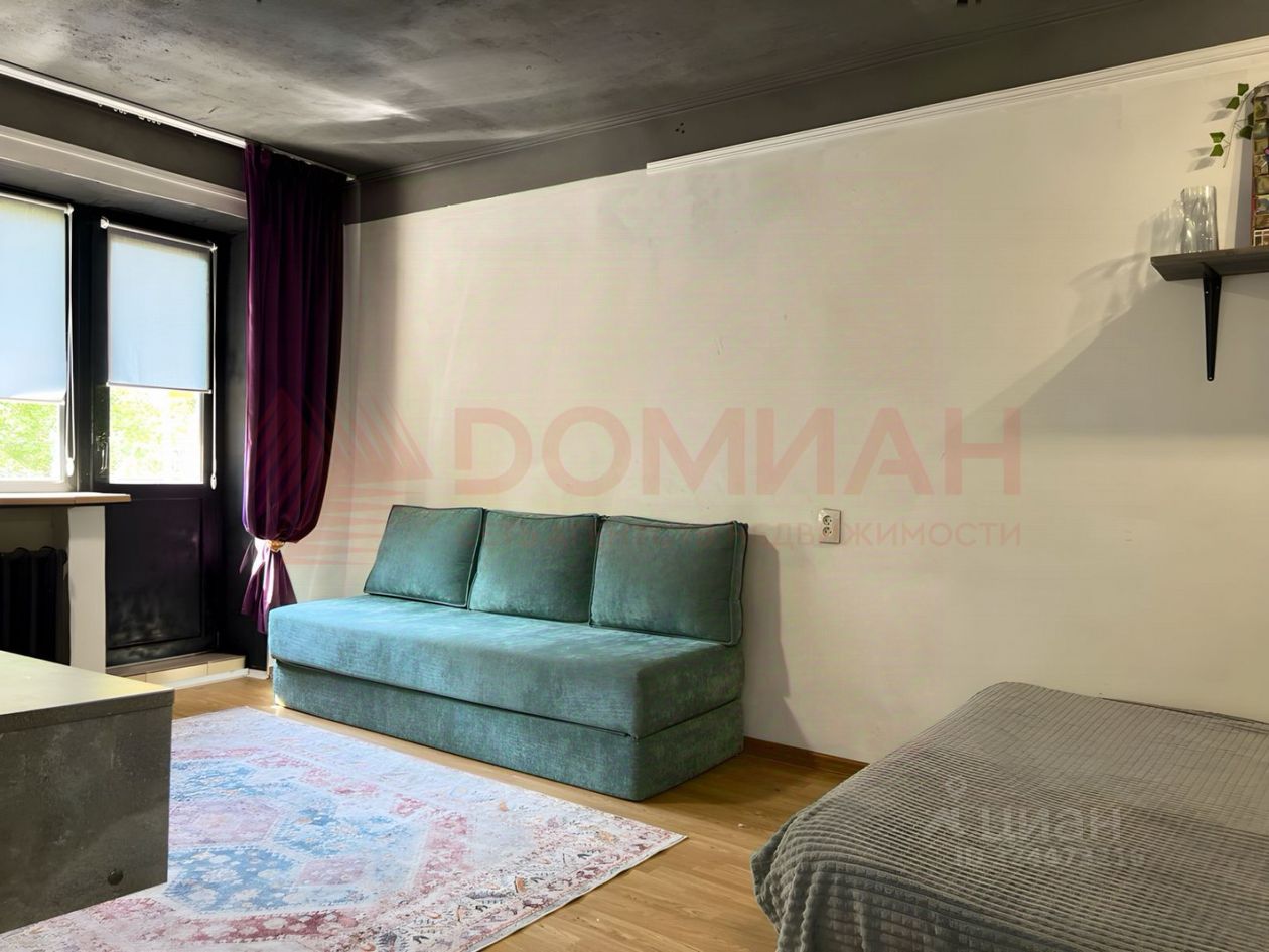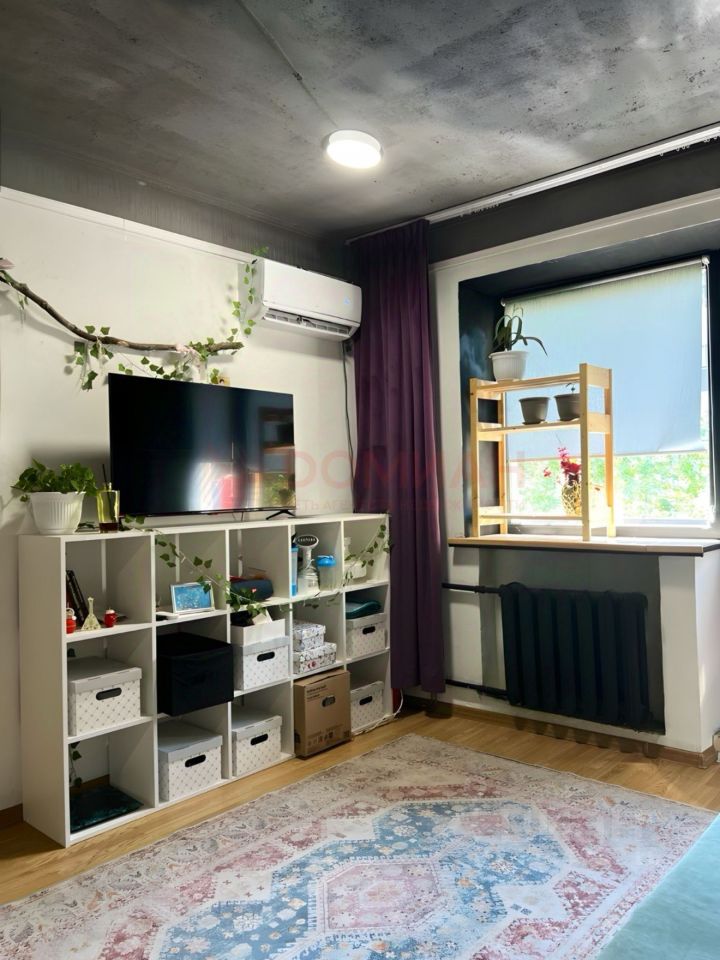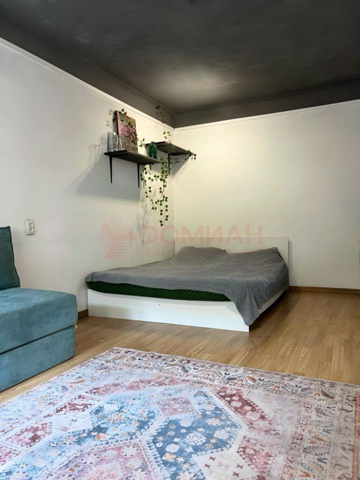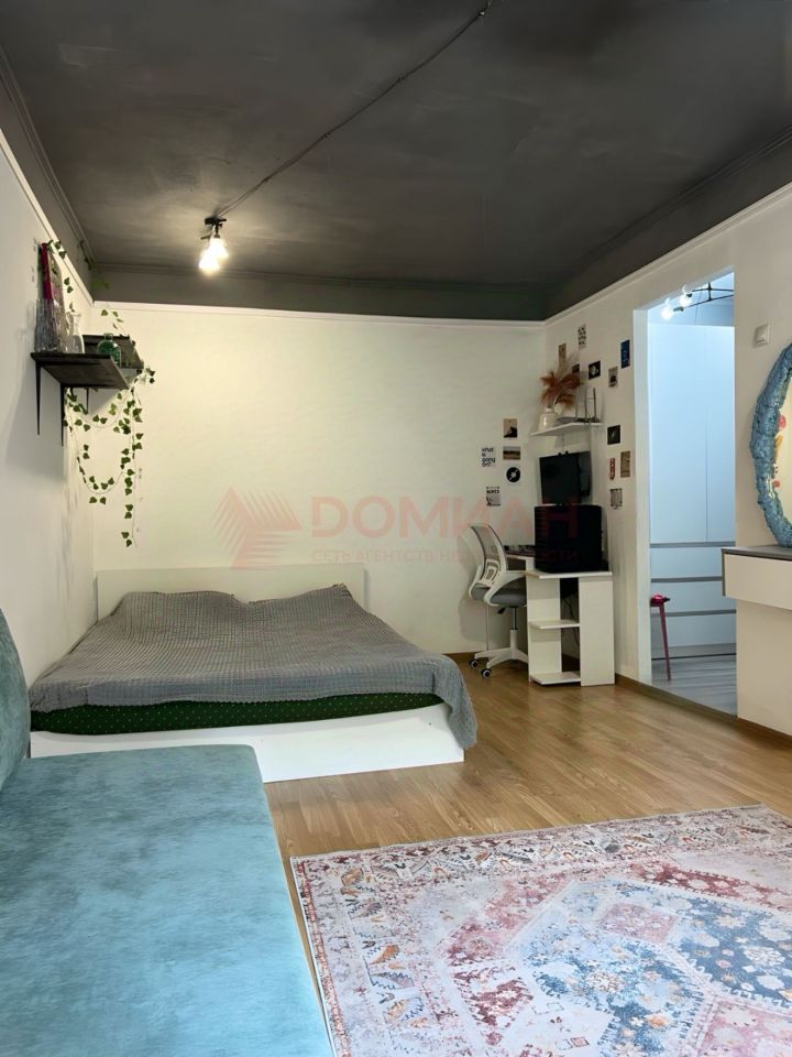 В квартире выполнен качественный ремонт в современном стиле. Комната зонирована на гостиную и спальню с большой кроватью. Мебель и техника остаются частично.