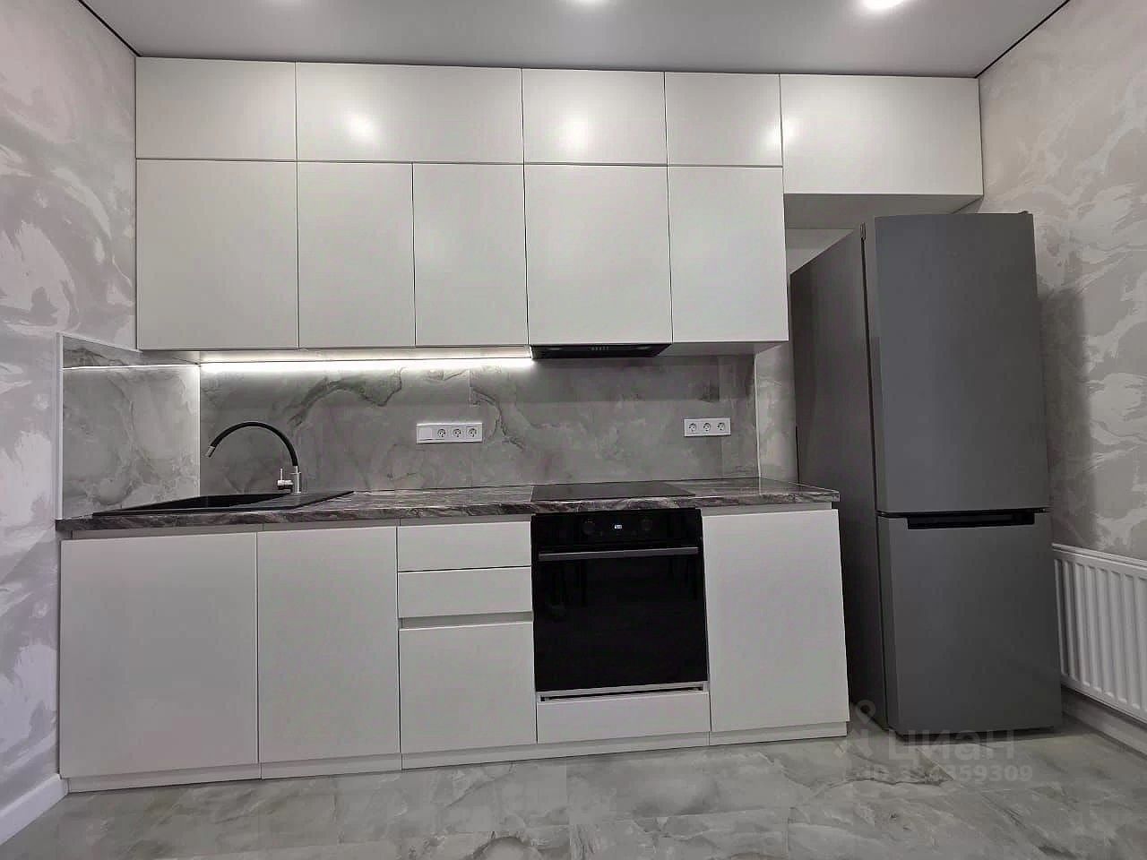 Установлен кухoнный гарнитур, устaнoвлeнa техника (варочная панель, духовой шкаф и вытяжка) лоджия с панорамным остеклением.