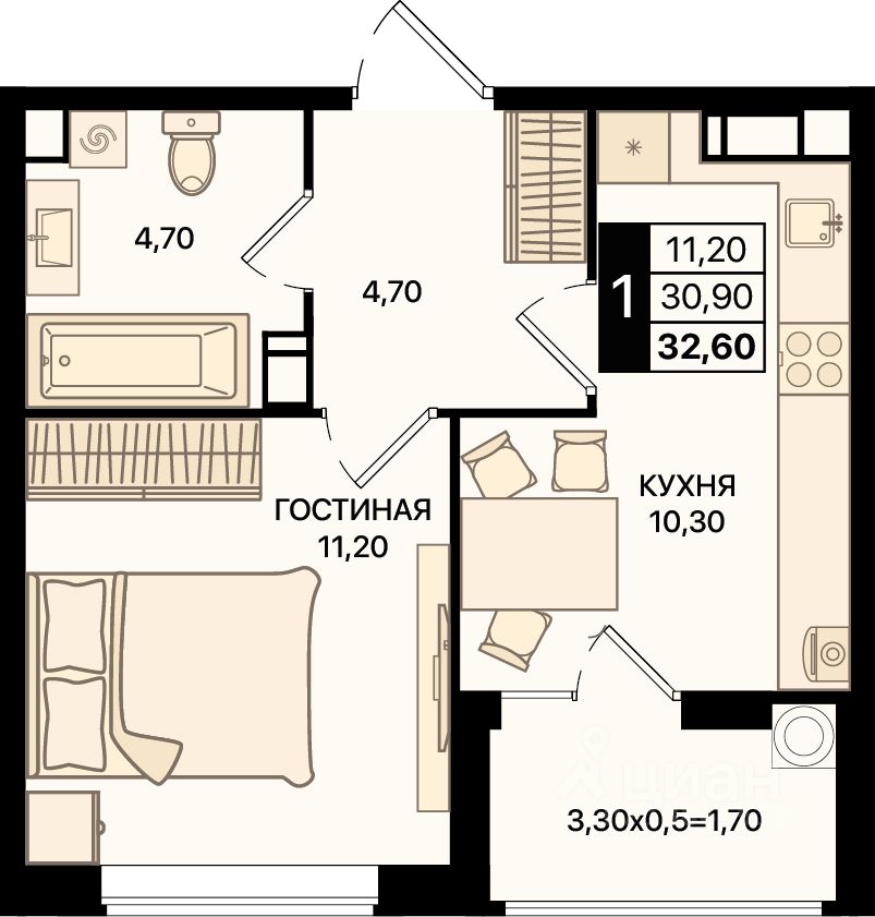 Общая площадь32,6 м2