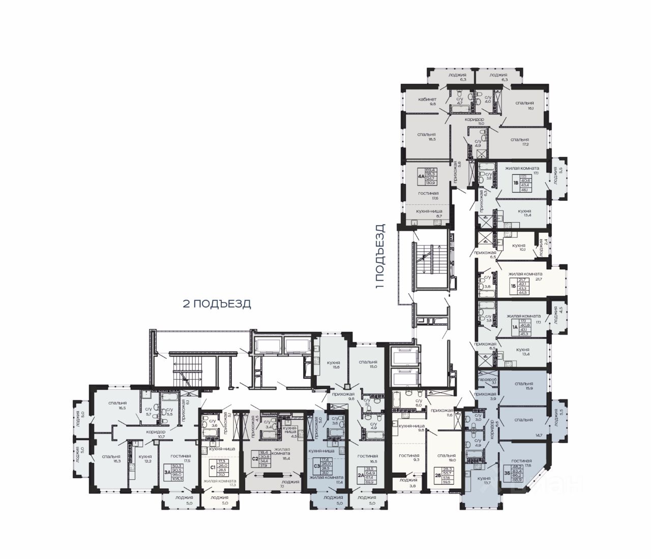 Планировка 4 изолированные светлые комнаты большая кухня-гостиная 26,3 кв.м. 3 санузла панорамные окна 2 лоджии по 6,3 кв.м. 8 этаж