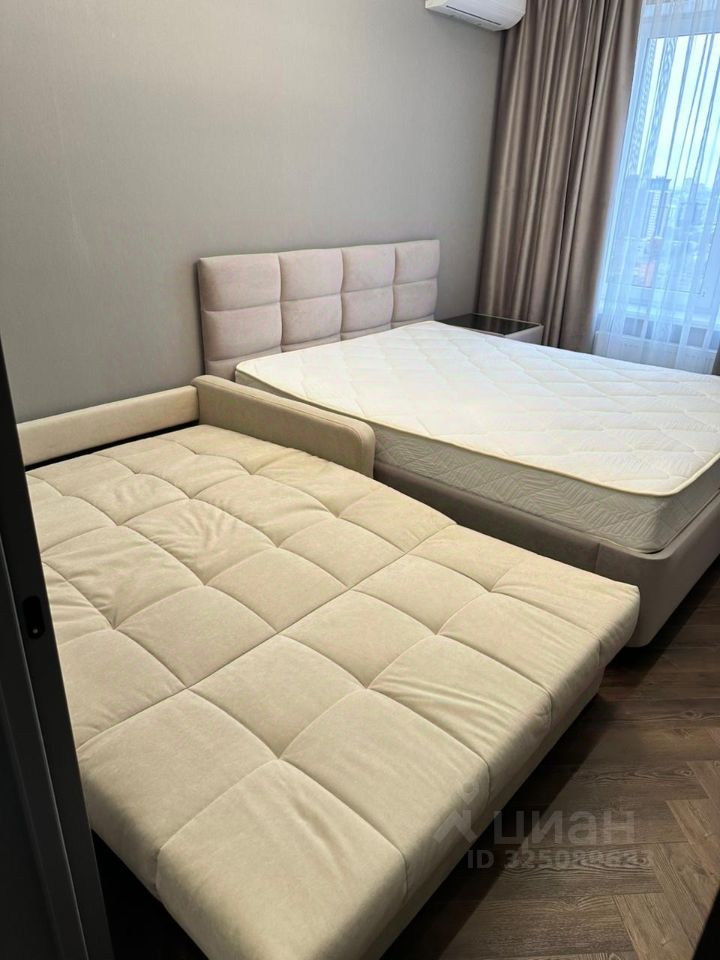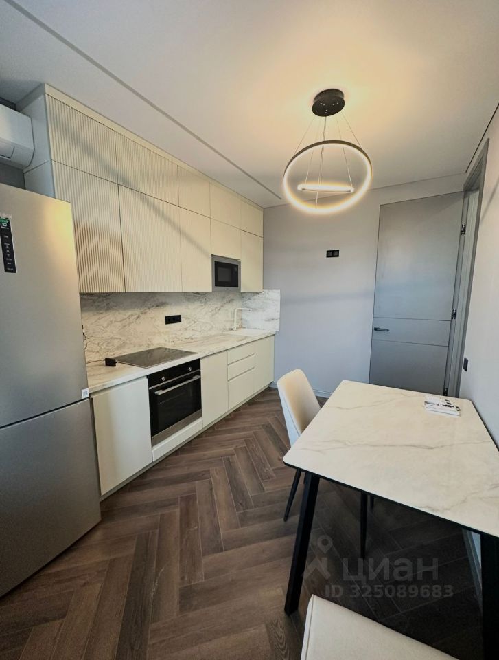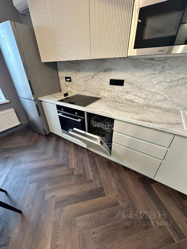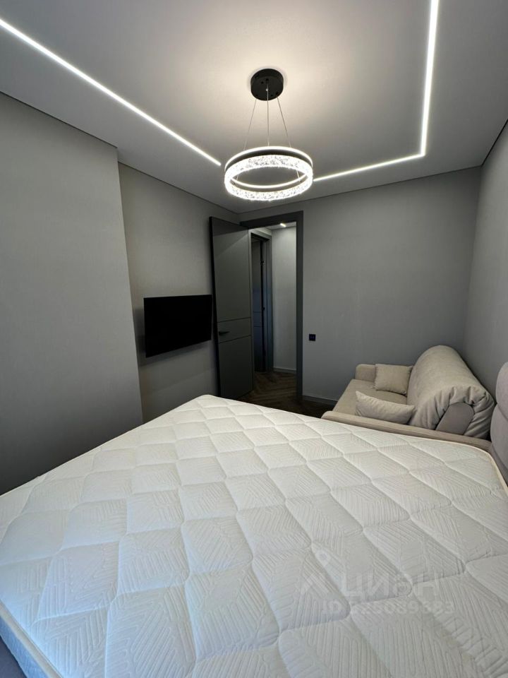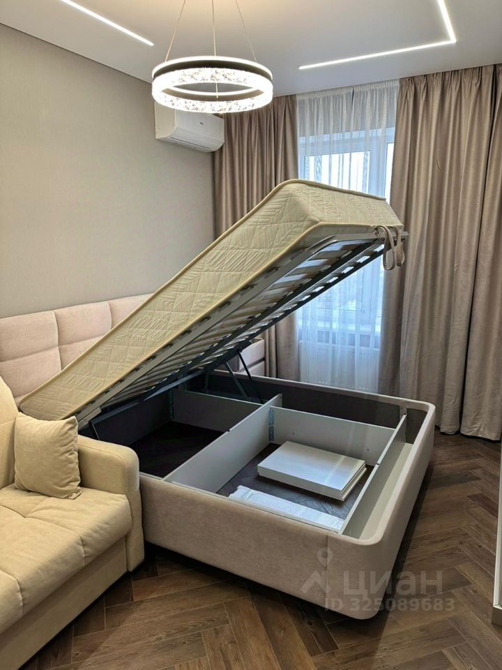 В комнате двуспальная кровать, прикроватная тумба Орматек, диван, телевизор. Подсветка управляется через Алису. Кондиционер инверторный с управлением через Wi-Fi. На кухне установлена вся необходимая мебель - гарнитур, стол и 2 мягких стула. Из техники есть духовка, микроволновка, посудомоечная машина 45см, индукционная варочная поверхность, холодильник, кондиционер инверторный с управлением через Wi-Fi, а так же фильтр с системой обратного осмоса (питьевая вода из крана).