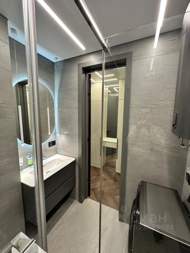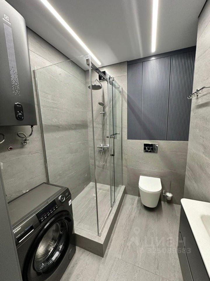 Это умная квартира Умный свет (световые линии встроенные в потолок) Умная дверь (фейс айди, отпечаткок пальца, управление со смартфона) Умный тёплый пол Умные розетки Умный полотенцесушитель Всё управляется с Алисы Вся техника Haier Двери высотой 2,4 метра