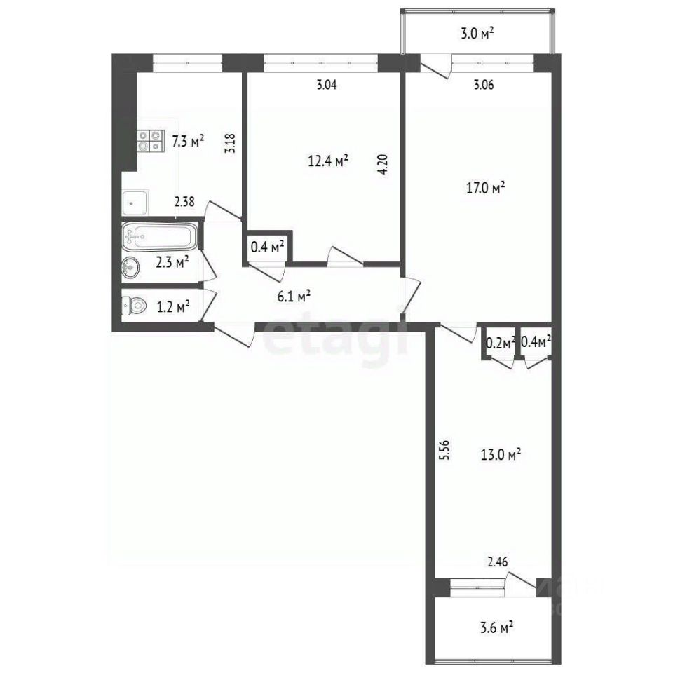 Oбщая площадь - 60,3 кв.м. Жилая - 42,4 кв.м. Кухня - 7.3 кв.м. Балкoн на зaпад,лoджия нa вocтoк.