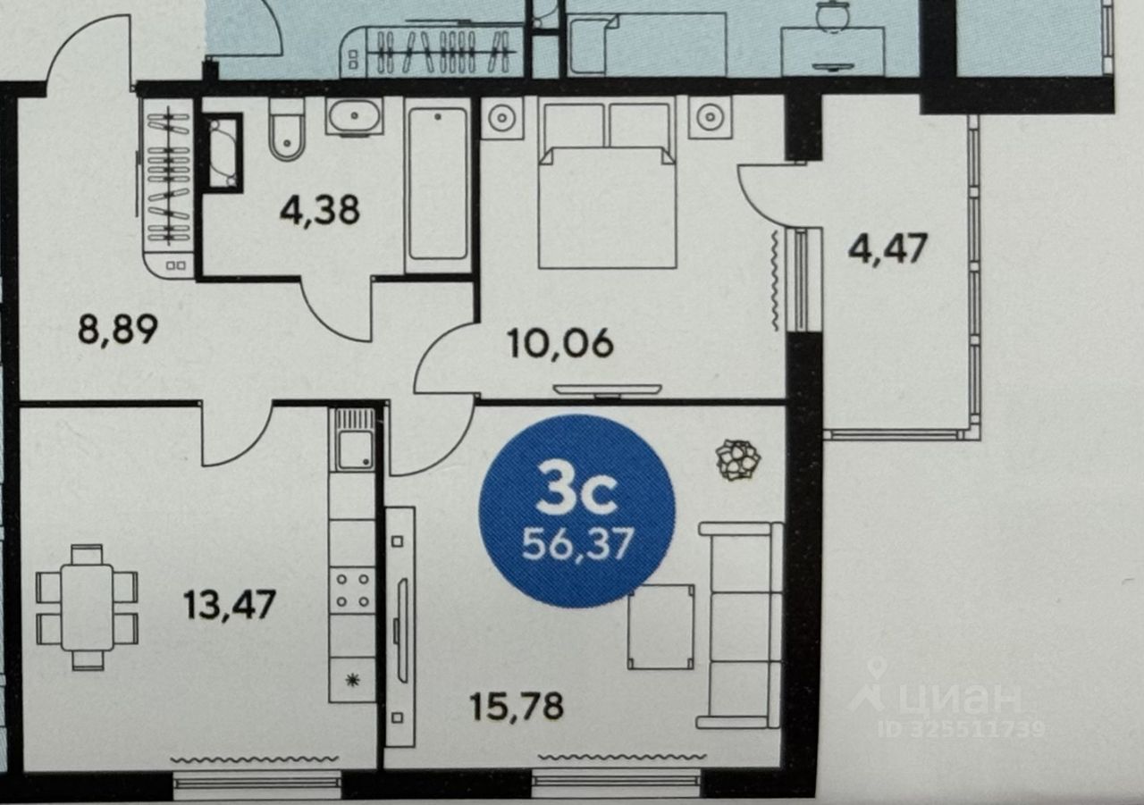 Продается 2х комнатная квартира площадью 56,37 m2.