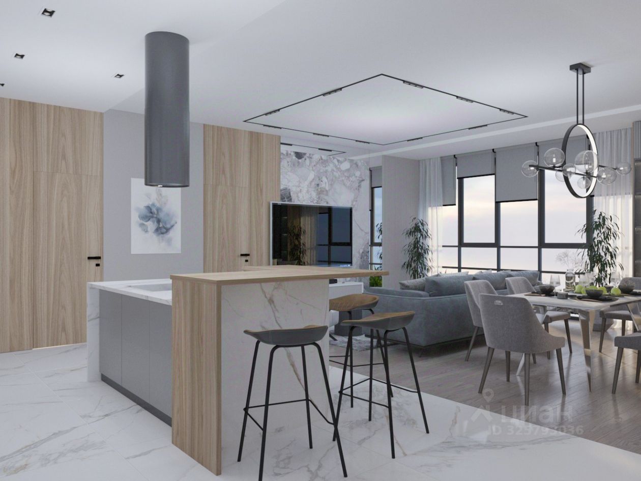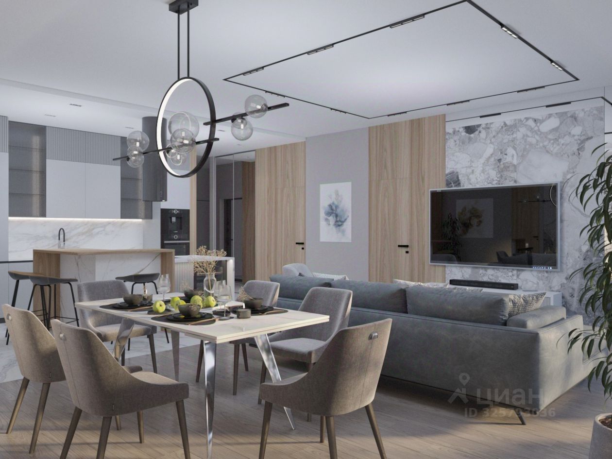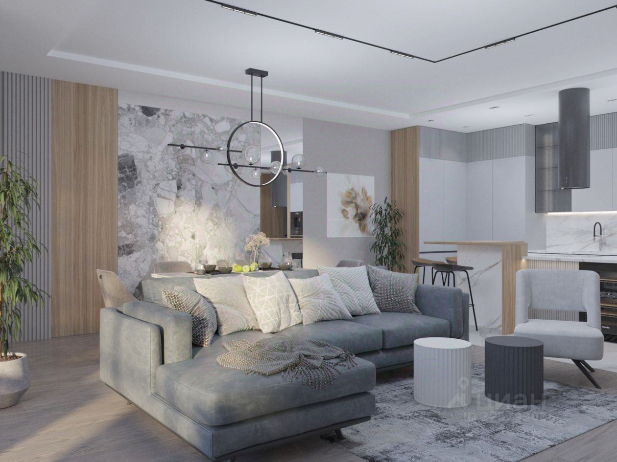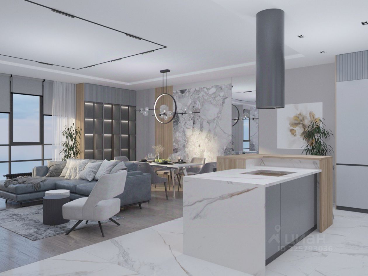 Планировка: кухня-гостиная, две спальни, два санузла, прачечная, гардеробная.
