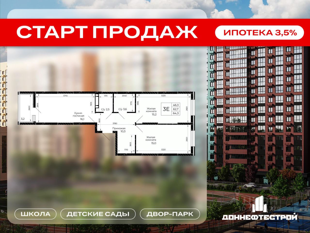 Продаётся 3-комнатная квартира в строящемся доме (Литер 4.1), срок сдачи: IV-кв. 2028, общей площадью 64.3 кв.м., на 11 этаже. Город стремительно развивается. Мы вместе с ним. Инфраструктура города пополняется новыми сервисами и полезными опциями, которые позволяют нам получать всё необходимое рядом с домом. В основе концептуального подхода СК ''ДОННЕФТЕСТРОЙ'' к развитию микрорайона ''Флора'' лежит формирование современного жилого и общественного пространства, интегрированного в живописную экологически благоприятную территорию на площади 30 гектаров. Вместе с жильём создана необходимая социальная, транспортная и коммерческая инфраструктура. В составе ''Флоры'' - два детских сада, трёхэтажная школа, физкультурно-оздоровительный центр, двор-парк с ландшафтным дизайном и фонтан.